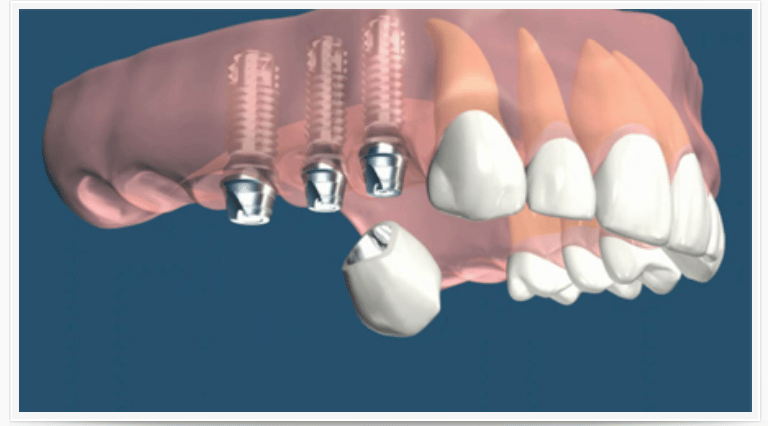 Une arcade dentaire complètement édentée peut être entièrement réhabilitée par des implants permettant la pose d’un bridge complet fixe, évitant le port d’un dentier complet très inconfortable.